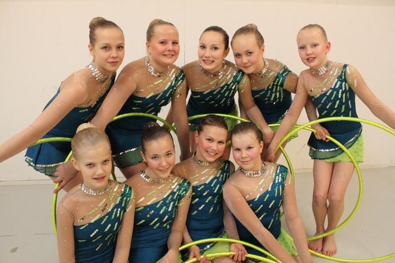 Suoritukseen valmistautuminen aloitettiin hyvissä ajoin ja ohjelmasta ehdittiin käydä tarvittavat kohdat läpi.Suoritusnumerolla 53. Arskat pääsivät astelemaan matolle kovien kannustusten saattelemana.Kaikenkaikkiaan suorituksessa oli juuri sitä,mitä valkut olivat tytöiltä viime aikoina vaatineetkin:ilmettä ja itsevarmuutta.Vanteenkin käsittely oli jo parempaa,vaikka suorituksessa ehdittiin pariin otteeseen siihen takertua.Pettymys oli suuri,kun tytöt kuulivat sijoittuneensa kategoriaan D.Muutama kuvan verran ehdittiin poseerata ennen kuin kiirehdittiin kotimatkalle.