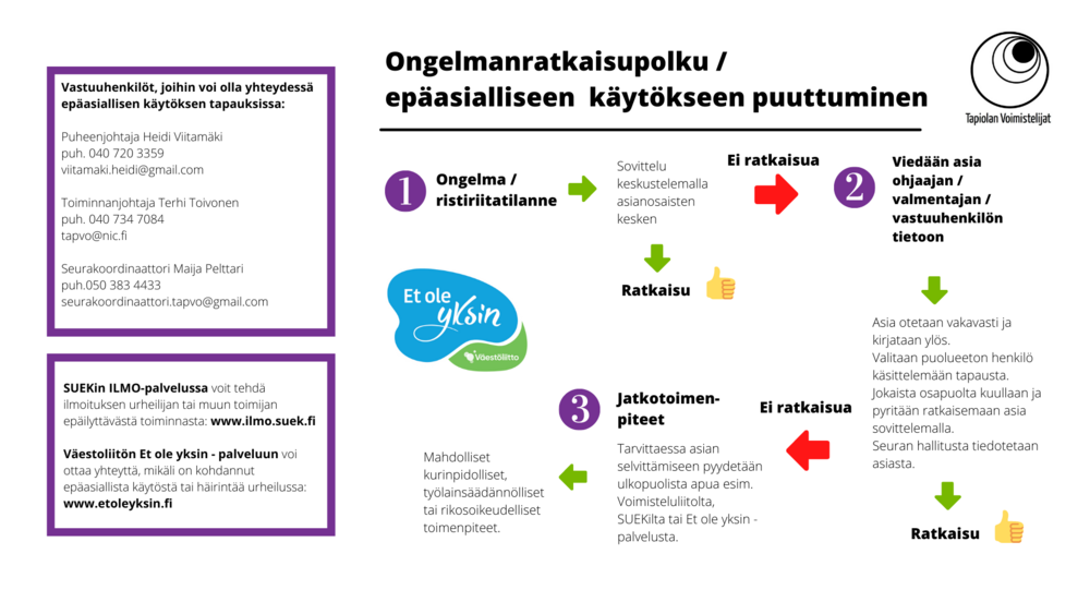 Luottamuksellinen ja turvallinen ilmapiiri on meille tärkeää ja kannustamme siihen, että mahdolliset ristiriidat selvitetään aina puhumalla asianosaisten kesken. Valmentajamme ovat tärkeässä roolissa luottamuksellisen suhteen ja ilmapiirin luomisessa joukkueeseensa. Mikäli voimistelija kokee syystä tai toisesta, ettei voi / halua antaa henkilökohtaisesti palautetta tai tuoda jotakin epäkohtaa tai mieltä askarruttavaa asiaa esille, voi hän tuoda huolensa esiin palautelomakkeessa. Käsittelemme palautteet viipymättä. Haluamme, että kynnys palautteen antamiselle ja mahdollisten epäkohtien esille tuomiselle on mahdollisimman matala.