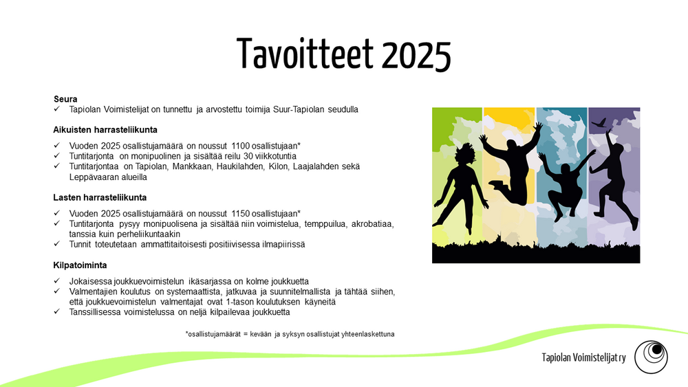 “Voimistelijamme kilpailevat kaikilla kansallisilla tasoilla kaikissa ikäluokissa tähdäten myös kansainvälisiin edustuspaikkoihin. Seuramme tunnetaan urheilijalähtöisestä valmennuksesta ja positiivisesta ilmapiiristä. Kilpatoimintaan pääsevät mukaan kaikki halukkaat. “